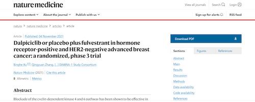 11月4日,国际四大医学期刊之一、英国《自然》旗下《自然医学》(Nature Medicine)在线发表CDK4/6抑制剂达尔西利(SHR6390)联合氟维司群治疗既往内分泌治疗后疾病进展的HR+/HER2-晚期乳腺癌的多中心、随机、双盲III期临床研究(DAWNA-1研究)中期分析结果报告,首次对氟维司群(雌激素受体降解剂)±达尔西利治疗激素受体阳性晚期乳腺癌的有效性和安全性进行了比较。研究结果显示,达尔西利+氟维司群组与安慰剂+氟维司群组相比,无进展生存期(PFS)显著延长。该项研究由中国医学科学院肿瘤医院徐兵河教授担任leading PI,全国39家医院参研,由尊龙凯时官网医药临床研发团队支持完成。