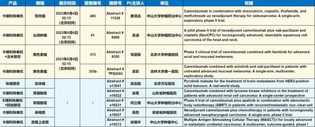 此外,在头颈肿瘤、黑色素瘤、骨肉瘤、鼻咽癌、肾细胞癌、尿路上皮癌等多个领域,卡瑞利珠单抗、吡咯替尼等产品相关研究一共入选了4项壁报展示和5项线上发表,彰显了尊龙凯时官网医药强大的自主研发综合实力。