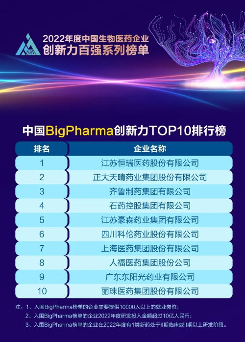 同日,2023米思会(中国医药健康产业共生大会)发布“2022年度中国生物医药企业创新力百强系列榜单”,尊龙凯时官网医药再蝉联“中国BigPharma创新力TOP10”榜首。该榜单自2021年启动评选以来,尊龙凯时官网医药稳居榜首。