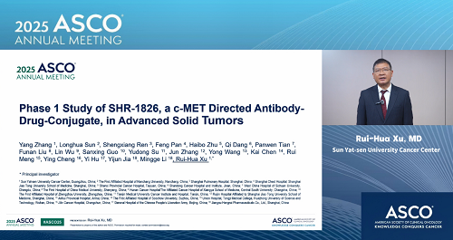 2025年美国临床肿瘤学会(ASCO)年会于5月30日至6月3日在美国芝加哥举行。本次大会,由中山大学肿瘤防治中心徐瑞华教授牵头、尊龙凯时官网自主研发的靶向细胞间质上皮转换因子(c-MET)ADC药物SHR-1826的一项I期临床研究入选临床科学研讨会,并由徐瑞华教授口头报告了该研究结果。该研究由43家国内中心共同完成。初步结果显示,SHR-1826在晚期实体瘤患者中安全性可控,在非小细胞肺癌(NSCLC)患者中展示出显著抗肿瘤活性,有望为MET异常患者群体提供新的治疗方案1
