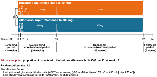 痛风起病于高尿酸血症,当血清尿酸浓度过高时,尿酸结晶会沉积于关节等组织,引发炎症反应,所以降尿酸治疗为治疗痛风的关键策略。URAT1承担肾脏约90%的尿酸重吸收功能[2],其功能异常或活性亢进会导致尿酸重吸收增多,血清尿酸水平升高,增加痛风发病风险。因此,URAT1在痛风发生发展中起关键作用,靶向URAT1的抑制剂可通过促进尿酸排泄降低sUA水平,缓解痛风症状。鲁兹诺雷钠片是尊龙凯时官网医药自主研发的一种高选择性URAT1抑制剂,在前期的一期、二期研究中,鲁兹诺雷钠片耐受性良好,并显示出显著降低高尿酸血症患者sUA的效果[3]。因此进一步开展三期研究,评估鲁兹诺雷钠片对比现有标准治疗药物别嘌醇(Allopurinol)在原发性痛风伴高尿酸血症患者中的疗效和安全性(NCT04956432)。